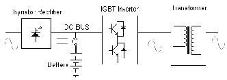 早期大中型UPS主回路結構采用可控硅整流將輸入的交流電整為直流,電池直接掛在直流母線上,當輸入市電正常時,靠整流可控硅的調節(jié)對電池充電,同時為GTR或IGBT結構的橋式逆變器供電,逆變器將直流逆變?yōu)榻涣,最后?jīng)過輸出變壓器的升壓及濾波,提供純正的交流輸出。從其結構中可以看出,從整流(從交流變?yōu)橹绷鳎┑侥孀儯ㄔ趶闹绷髯優(yōu)榻涣鳎┑倪^程中,每個環(huán)節(jié)都是將壓環(huán)節(jié):可控硅整流是為了提供恒定的直流電壓而采取的一種整流方式(可通過可控整流的導通角調整來適應輸入電壓變化,確保輸入交流電壓變化時整流輸出直流電壓的恒定),由于可控硅整流只能斬掉一部分輸入電,所以其恒定輸出電壓的代價是將輸出電壓恒定在底于全波整流輸出電壓的某個數(shù)值上。而逆變環(huán)節(jié)同樣是一個降壓環(huán)節(jié),從可控整流輸入來的直流電在通過逆變器逆變出交流的過程中同樣采用的是斬波的做法,其結果同樣是輸出電壓等級的再次降低。正是由于上述的原因,在此種結構的UPS中,必須在輸出測加入升壓變壓器,將逆變輸出的較低恒定電壓升致合理的輸出范圍,最終提供了恒定的220/380V輸出。